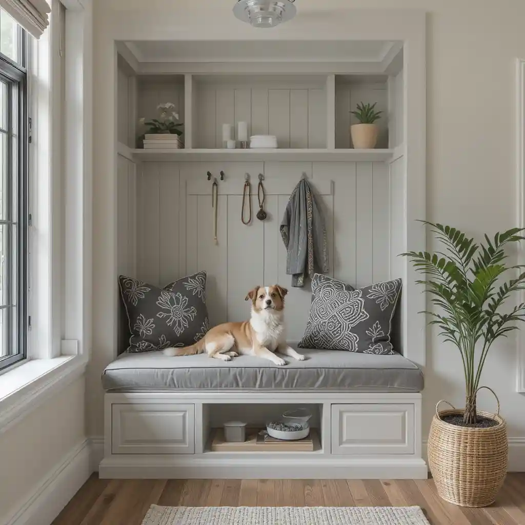 Give your pet a stylish living room nook with a raised cushion bed, food station, and hooks for leashes or toys. It blends with your décor while staying functional.