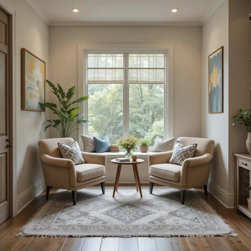Design a chat nook with two armchairs facing each other and a small table in between. Use soft lighting and round shapes to make it feel welcoming. Living Nook Ideas