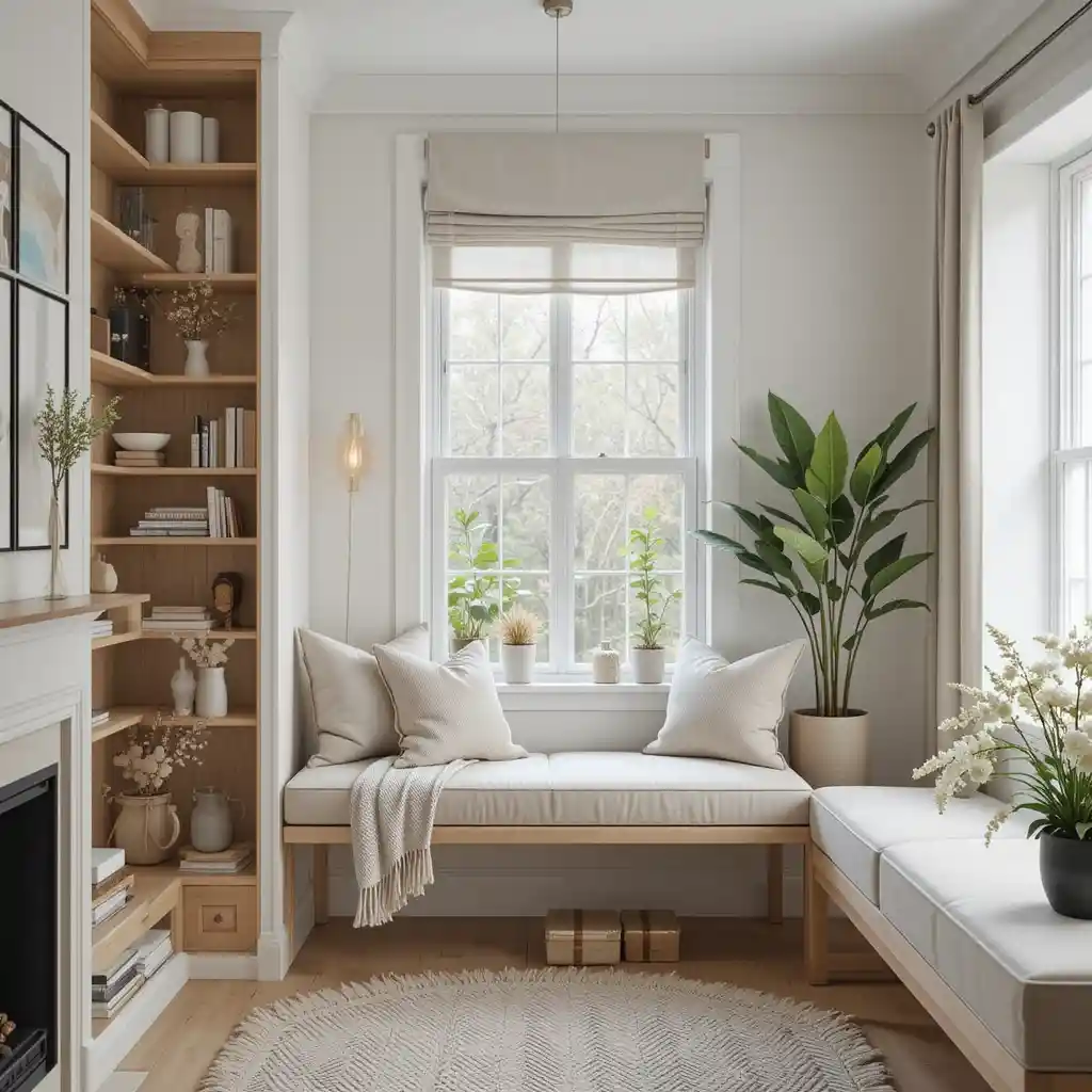 Go for a clean Scandinavian-style nook using light woods, white walls, and simple decor. Add a neutral-toned cushion bench or chair to keep the mood relaxed. Living Nook Ideas