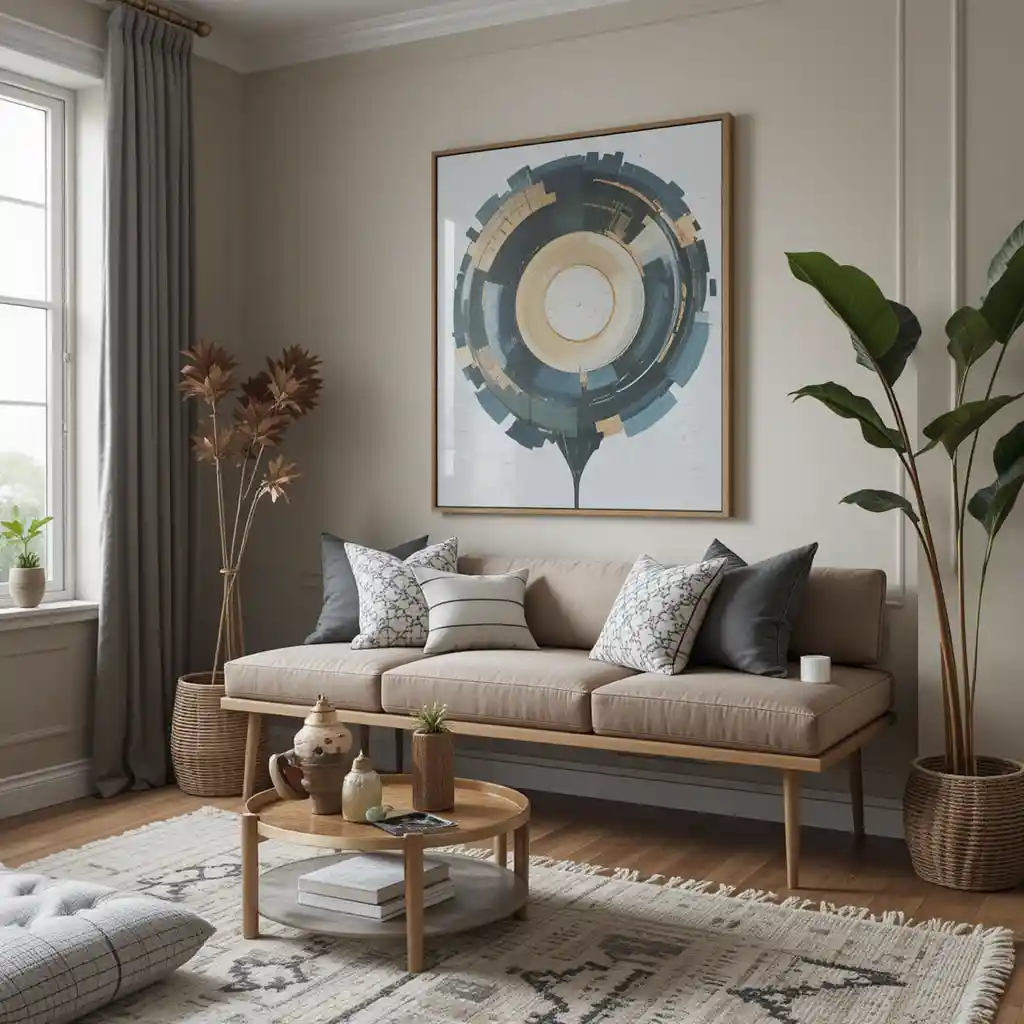 Add a floating bench under a large art piece to create an eye-catching yet space-saving nook. Style with a few minimal accessories to keep it modern.