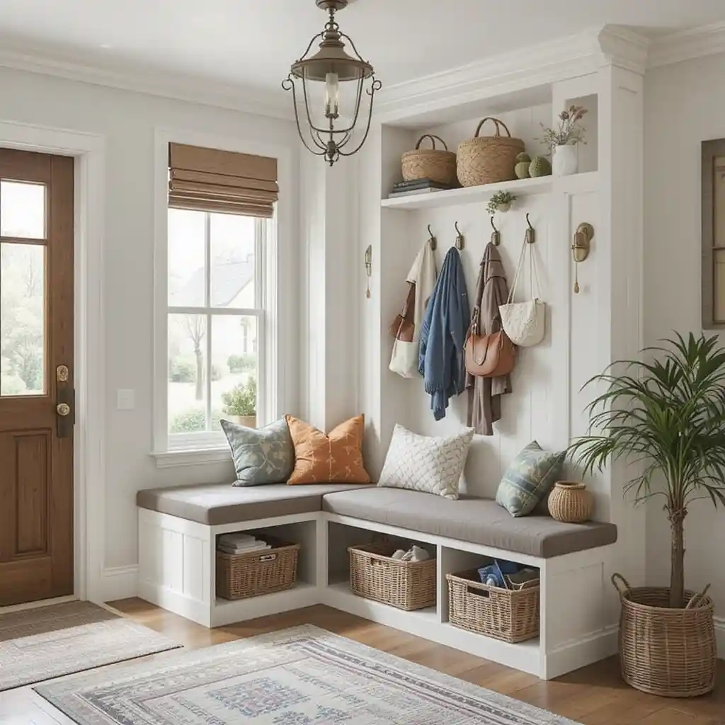 Make use of your entry area with a mudroom-style nook including hooks, a bench, and baskets. This keeps daily essentials organized and easily accessible.