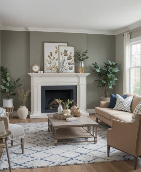 An accent wall painted in a muted shade like sage, navy, or clay adds depth without overpowering the room. It’s a smart way to introduce color into your living room decor.