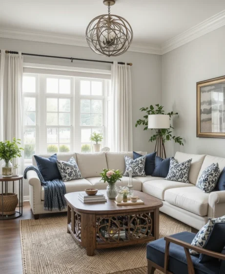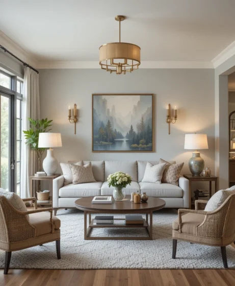 Using soft neutral colors like beige, cream, and warm gray creates a calm base. Add depth with textured pillows, chunky throws, and woven rugs. This approach keeps your living room decor timeless while still feeling warm and inviting.