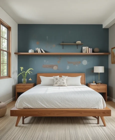 Floating shelves offer storage without visual heaviness. Display a few books or decorative objects to keep styling intentional and uncluttered Mid Century Modern Bedroom.