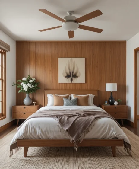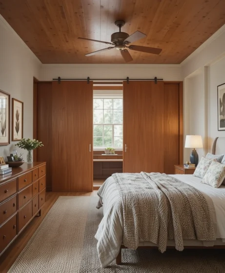 Wood-paneled sliding doors enhance the mid century vibe. They also save space, making them ideal for modern American homes.