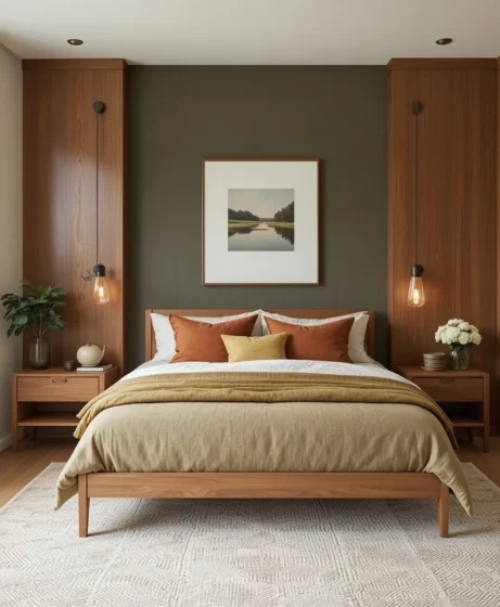 A single accent wall in muted teal, burnt orange, or olive green adds personality. Keep the remaining walls neutral for balance.