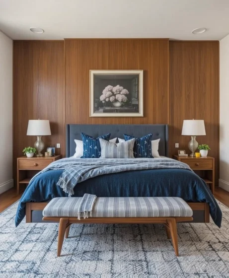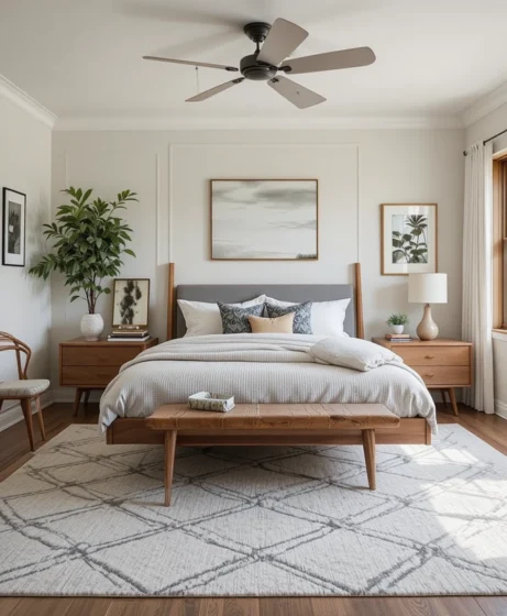 A rug with subtle geometric shapes adds texture without clutter. Stick to neutral or muted colors to maintain the clean aesthetic of a Mid Century Modern bedroom.