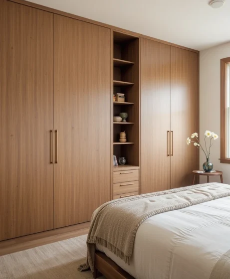Built-in wardrobes with flat-panel doors maintain a seamless appearance. They provide storage while keeping the room visually calm.
