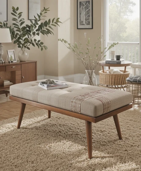 An accent bench placed at the foot of a bed or near an entryway adds style and practicality. Choose neutral upholstery and wooden legs for a cohesive Mid Century Modern furniture look.