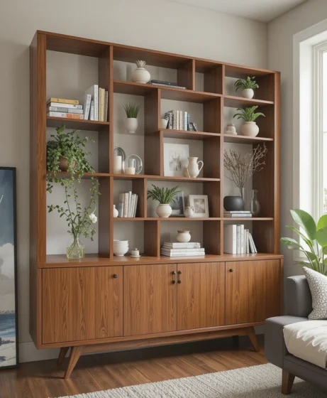 An open wooden bookshelf with geometric divisions adds structure and display space. Keep styling minimal with books, ceramics, and small plants for balance.
