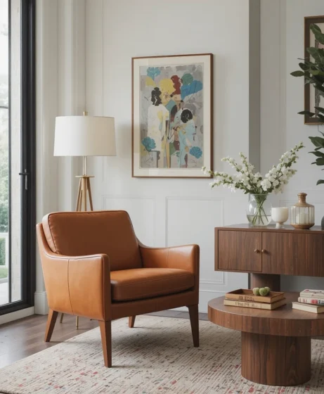 A caramel or cognac leather armchair captures the warmth of mid century design. It pairs beautifully with wood elements and adds texture to the room.