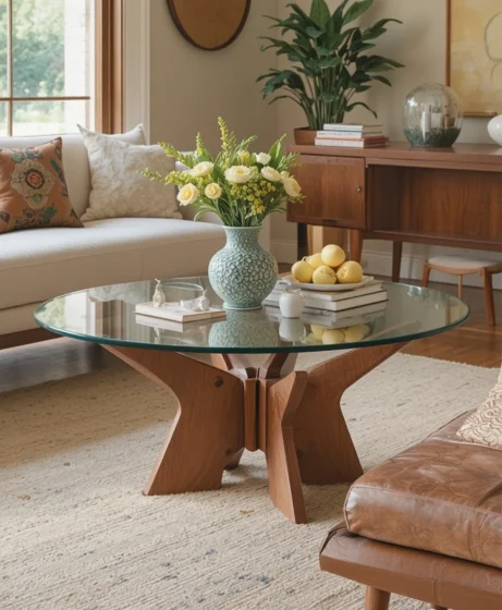 A glass tabletop supported by a sculptural wooden base feels light and elegant. It keeps the room visually open while showcasing artistic craftsmanship.