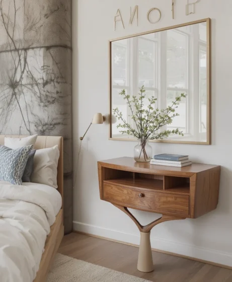 Wall-mounted nightstands create a clean and modern bedroom layout. They free up floor space and maintain the airy quality that defines Mid Century Modern furniture.