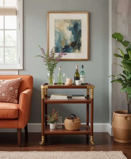 A compact bar cart with brass accents and wooden shelves adds personality to your living area. It’s perfect for entertaining while maintaining a retro charm.