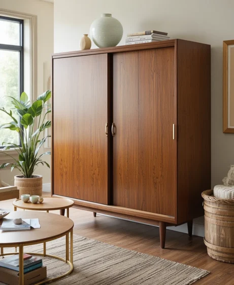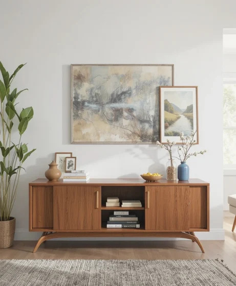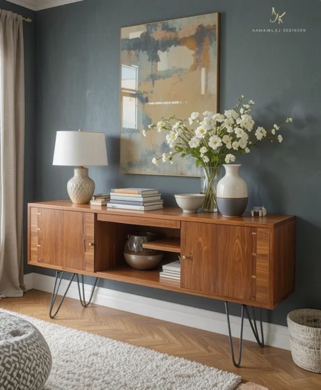 A low media console with sliding doors keeps electronics organized without dominating the room. Its clean lines and wooden finish perfectly match Mid Century Modern furniture themes.