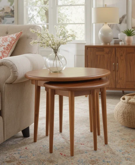 Nesting tables offer flexibility and space efficiency. Their simple wooden forms allow them to blend seamlessly into different rooms.