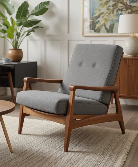 Unlike bulky modern recliners, mid century reclining chairs maintain sleek lines. The wooden frame and subtle reclining feature balance comfort with design.
