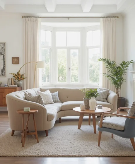 A gently curved sofa adds softness to a room filled with straight lines. It introduces movement while maintaining a structured look.