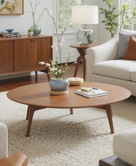 A round pedestal table encourages conversation and saves space. Its smooth edges and balanced design reflect the functional beauty of mid century interiors.