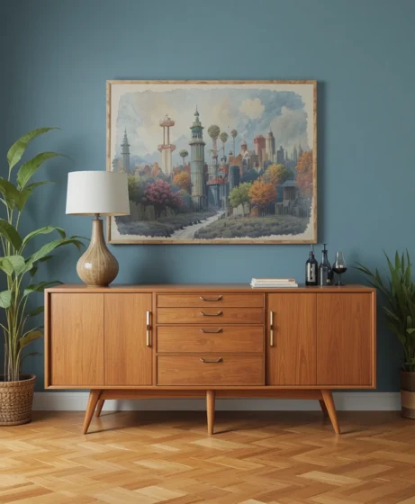 A teak sideboard offers both storage and visual appeal. Its slim handles and horizontal design reflect classic Mid Century Modern furniture aesthetics. Place it in a dining room or living area to add character.