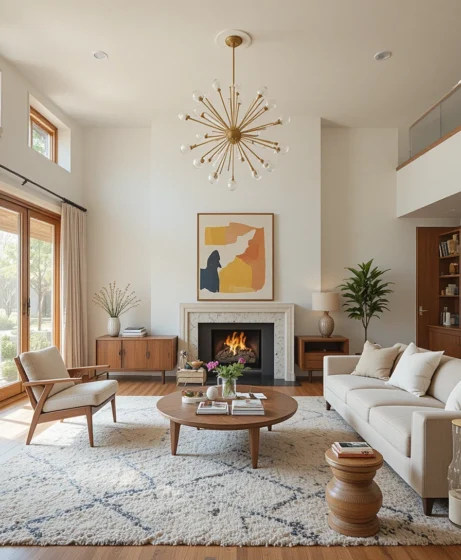 Lighting plays a major role in defining the space. A Sputnik chandelier adds sculptural interest and becomes a bold focal point. Its starburst design reflects classic Mid Century Modern living room style.