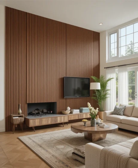 A vertical wood slat wall creates depth and texture. This feature enhances the warmth of the room and complements other wooden elements. It adds architectural character without clutter.