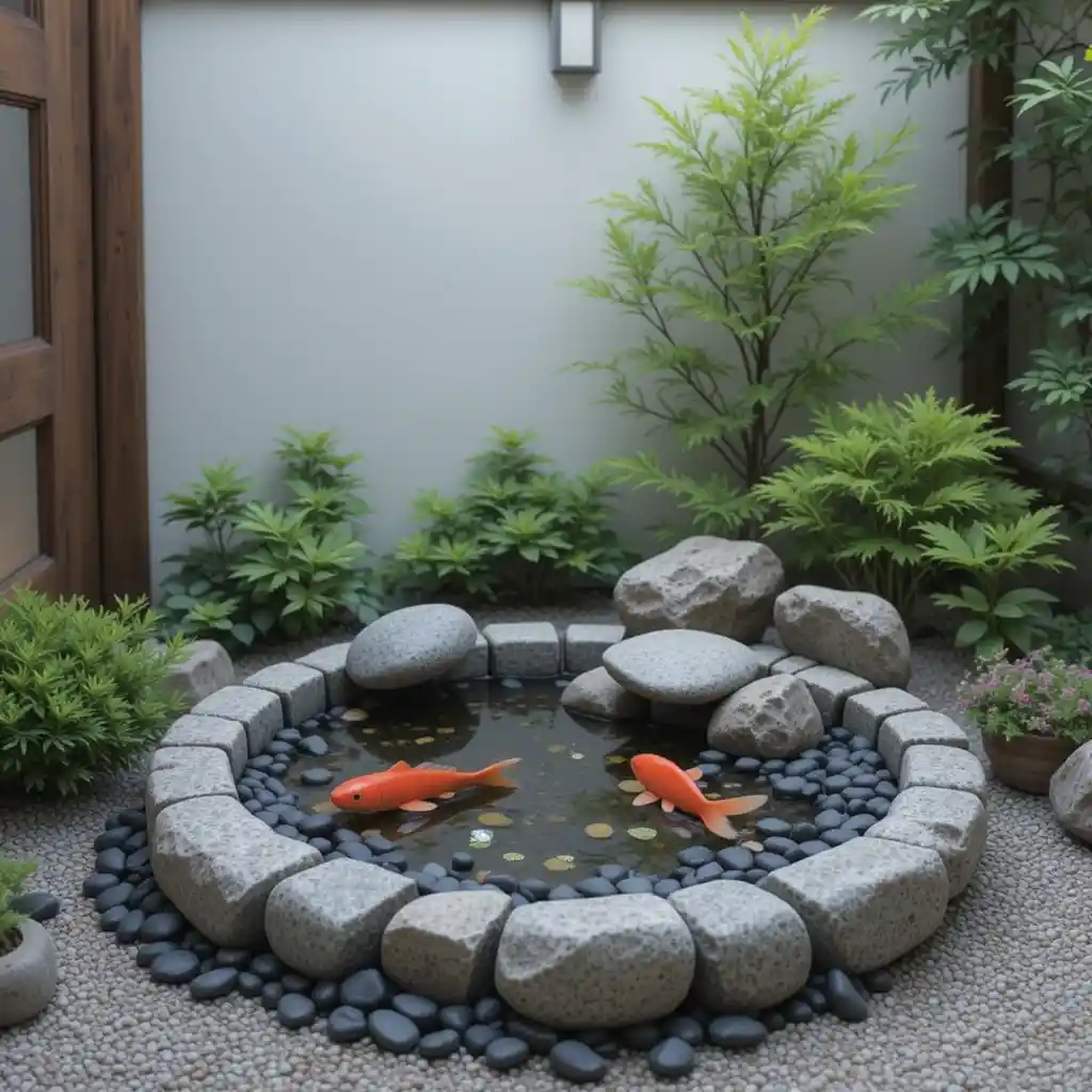 Mimic the look of a koi pond using dark pebbles and small stone fish sculptures. This idea offers charm without the need for real water.