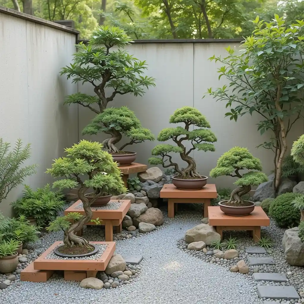 Create a mini bonsai display using terracotta pots and elevated trays. Keep it neat and allow the intricate shapes of the trees to take center stage.