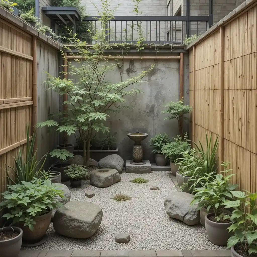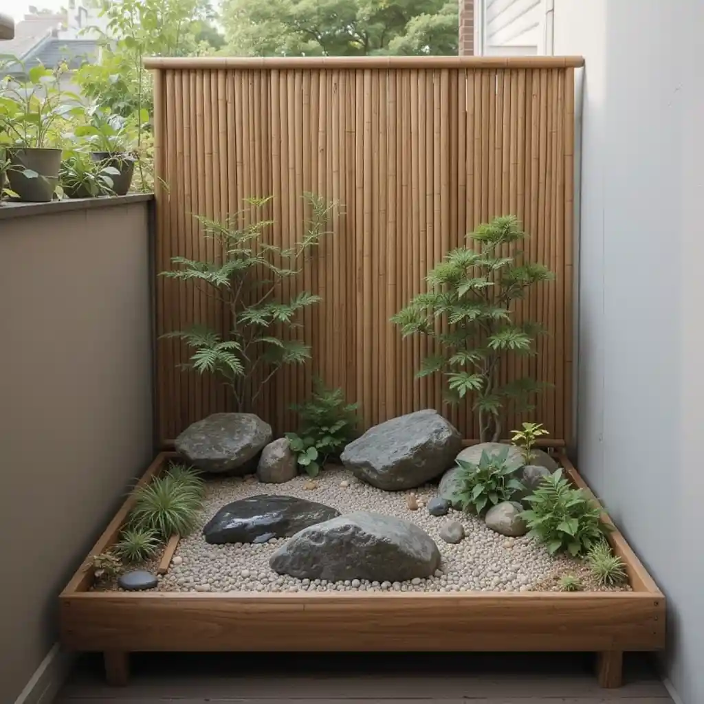 Build a small gravel courtyard between potted greenery and bamboo fencing. This setup brings a Tokyo townhome vibe to any apartment patio.