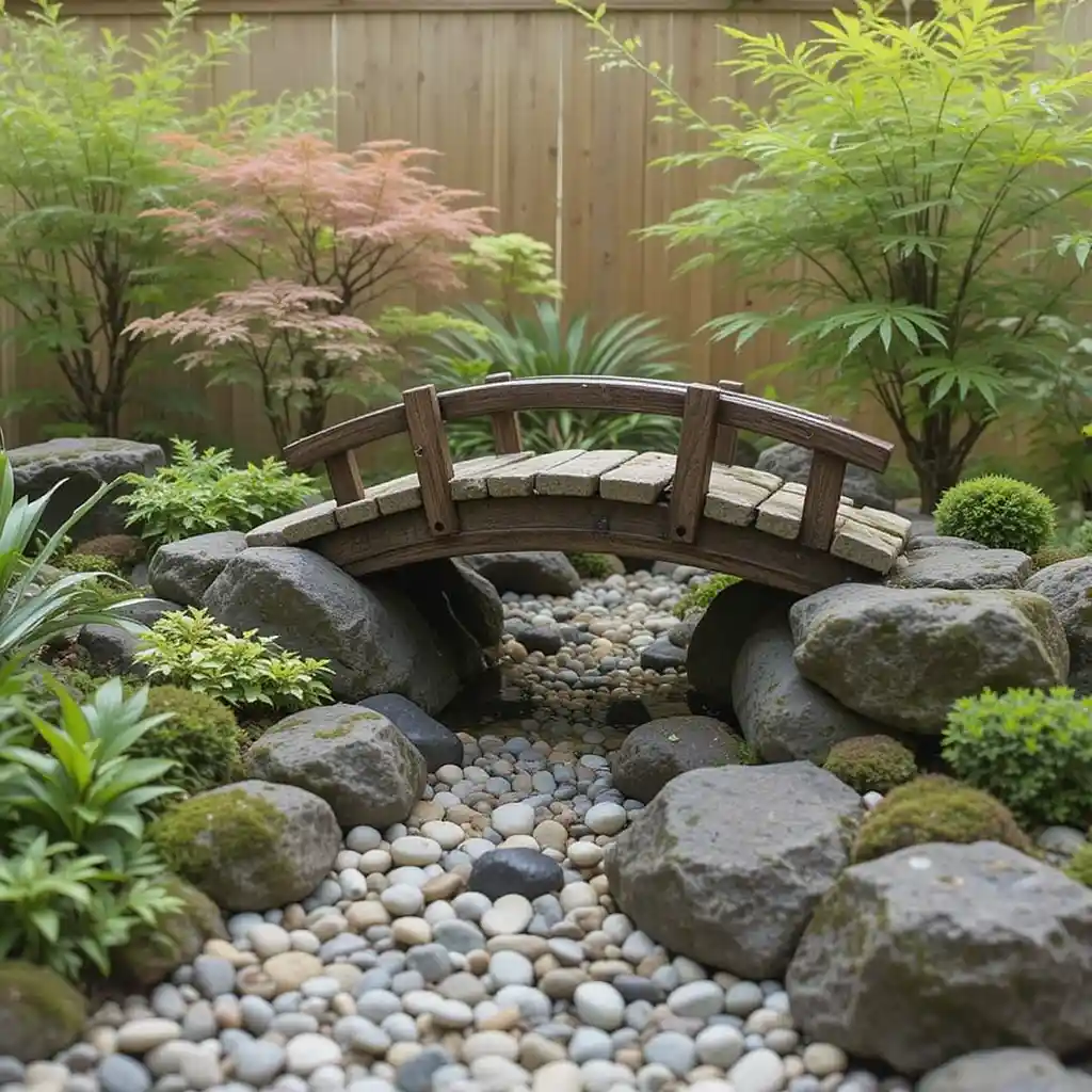 Place a tiny arched bridge over a dry stream bed made from polished pebbles. This brings movement and symbolism to even a small flowerbed.