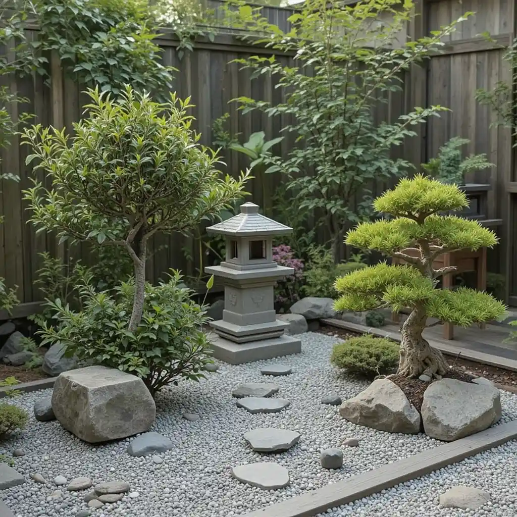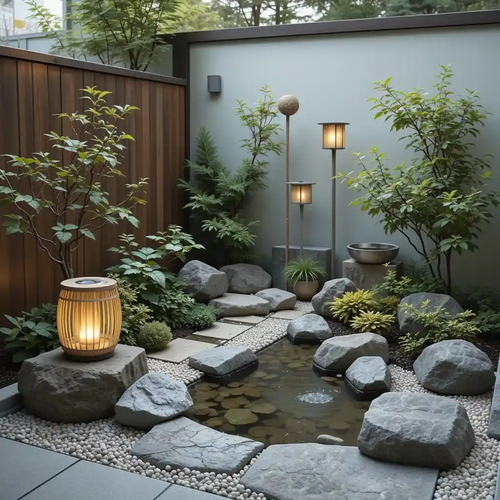 Use solar-powered or candle-lit Japanese lanterns for evening ambience. Choose stone or bamboo designs to stay true to theme. Mini Japanese Garden Ideas