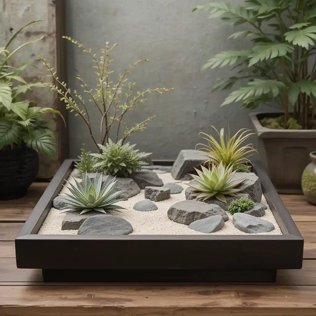 Create a tabletop Zen garden using white sand, pebbles, and miniature rakes. This calming tray setup encourages daily mindfulness and adds traditional Japanese beauty to any corner. Mini Japanese Garden Ideas