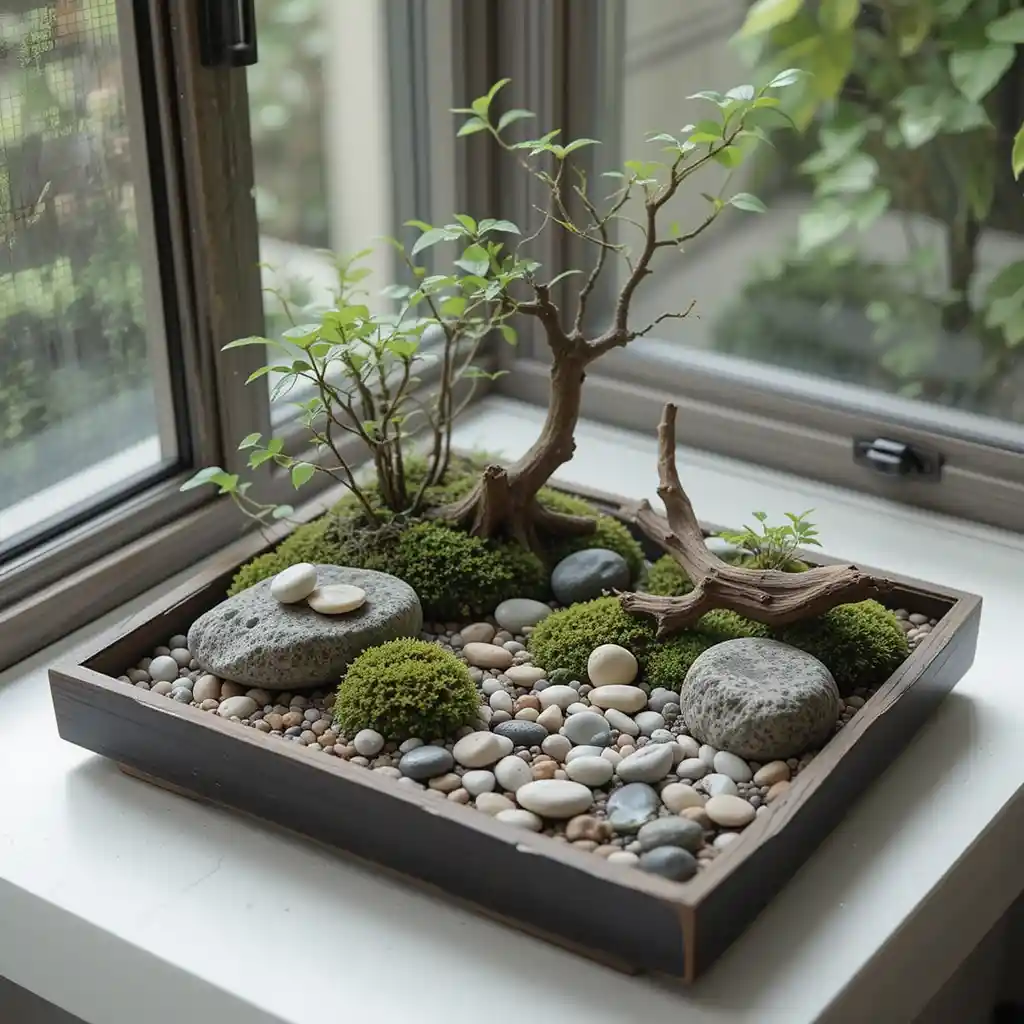 Bring Zen inside with a tray garden using pebbles, moss, and driftwood. Keep it on a windowsill or tabletop to bring serenity indoors. Mini Japanese Garden Ideas