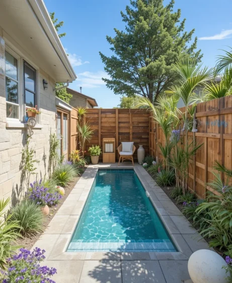 A narrow lap-style mini pool allows light exercise in limited space. It supports fitness routines while maintaining a sleek, streamlined appearance that fits urban homes Mini Pool.