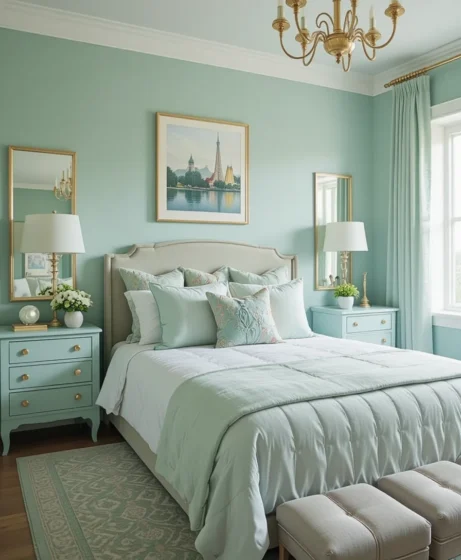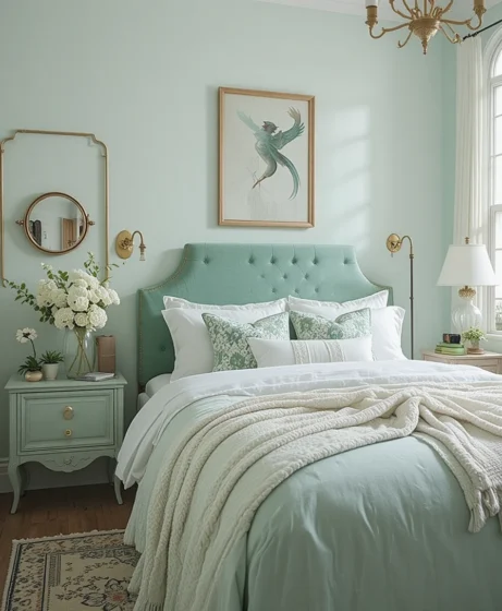 A mint green headboard creates a striking focal point. Whether upholstered, wooden, or metal, mint adds charm and elegance. It gives your bed character and sets the tone for the entire room Mint Green Bedroom.