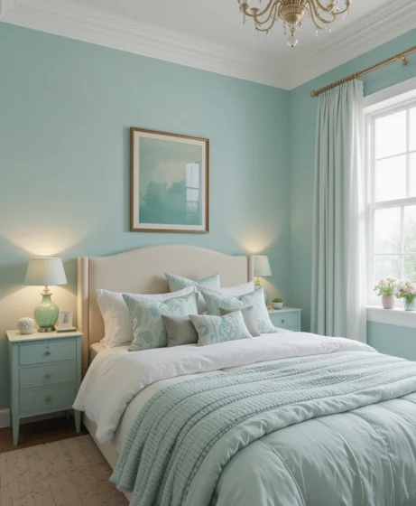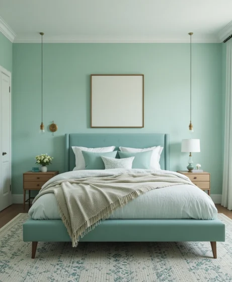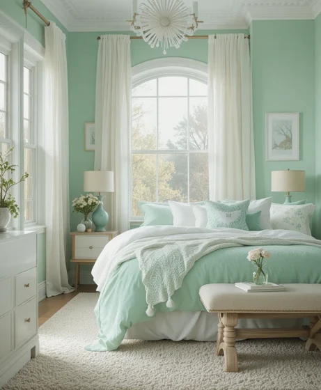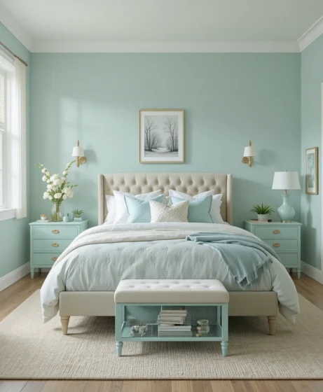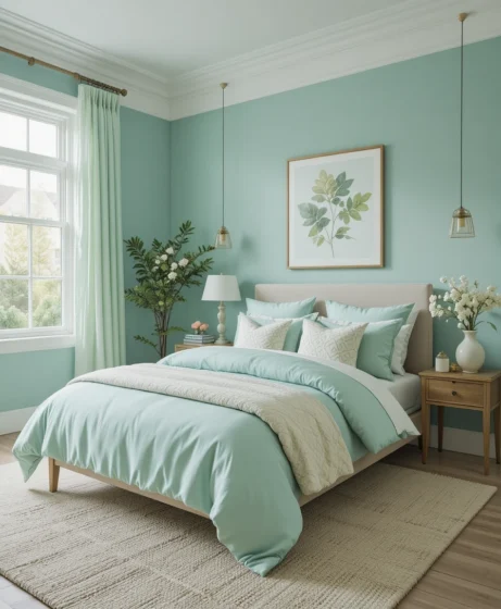 Mint green is one of the most refreshing colors you can use in bedroom décor. It’s soft, soothing, and naturally calming — perfect for creating a peaceful space that feels open and airy.