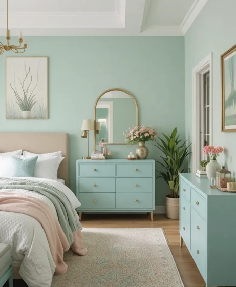Gold accents elevate mint green by adding a touch of luxury. Use gold lamps, picture frames, drawer handles, or mirror trims. The metallic shine balances the soft mint beautifully, creating a chic and elegant look.