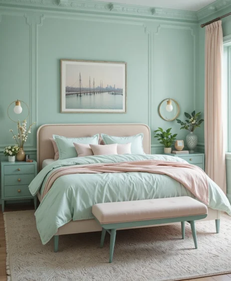 Combine mint green with pastels like blush pink, lavender, or baby blue for a dreamy, soft bedroom. These colors blend harmoniously without overpowering each other. This palette creates a romantic and calming environment Mint Green Bedroom.