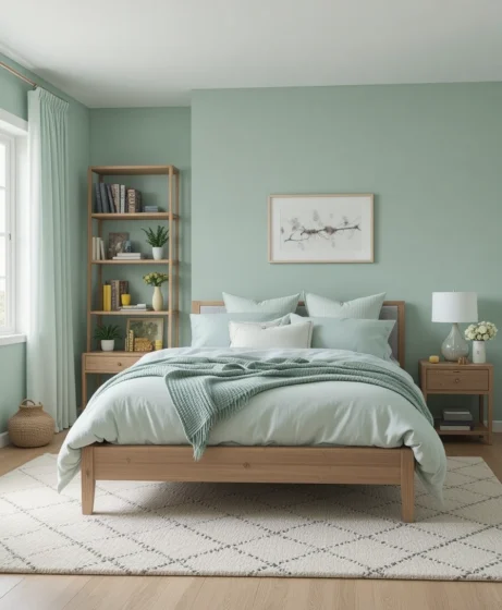 Natural wood tones bring warmth to the coolness of mint green. Wooden bed frames, nightstands, or shelving soften the color beautifully. This combination creates a balanced, organic, and earthy bedroom atmosphere.