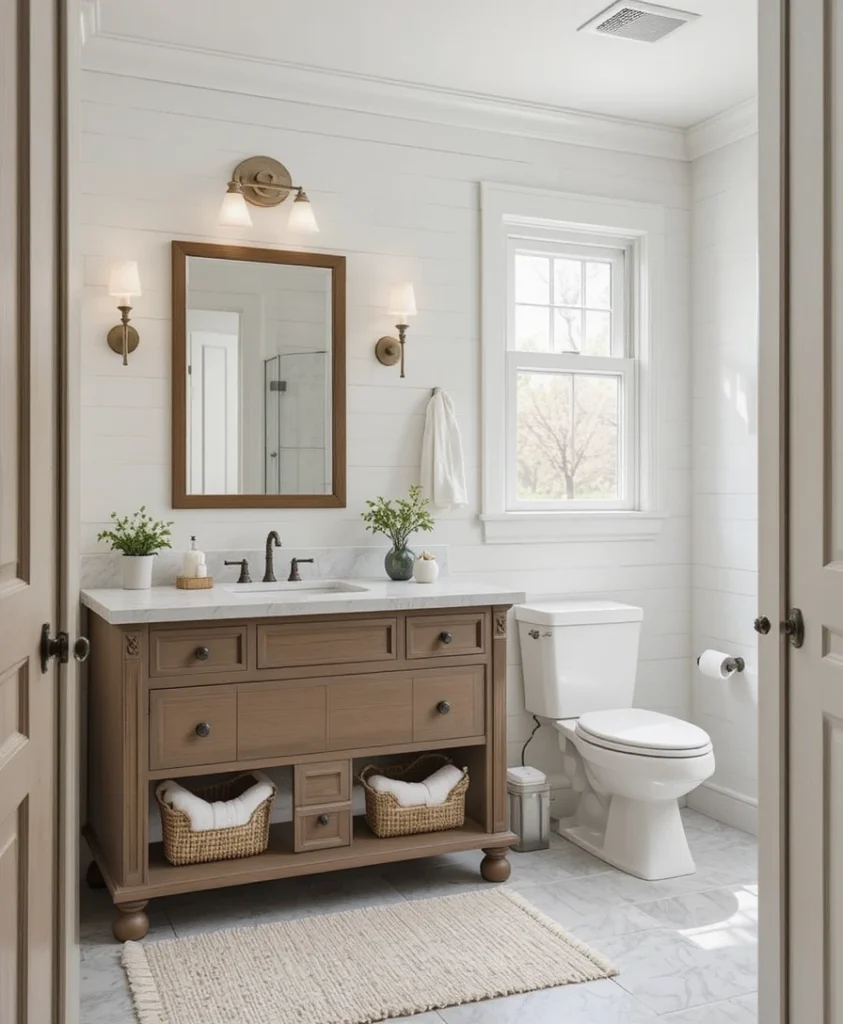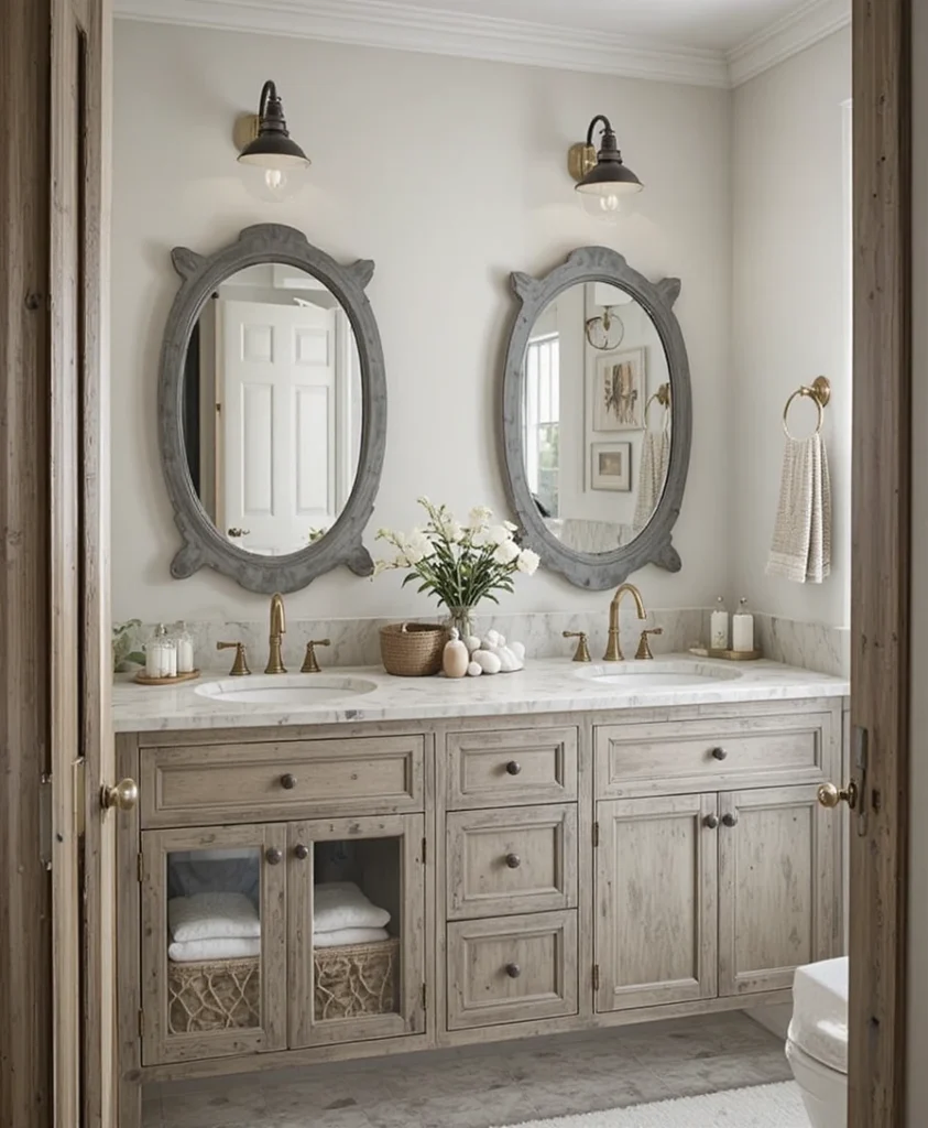 with antique mirrors, mason jars, and metal baskets. A few carefully chosen pieces make your space look curated, not cluttered. Modern Farmhouse Bathroom