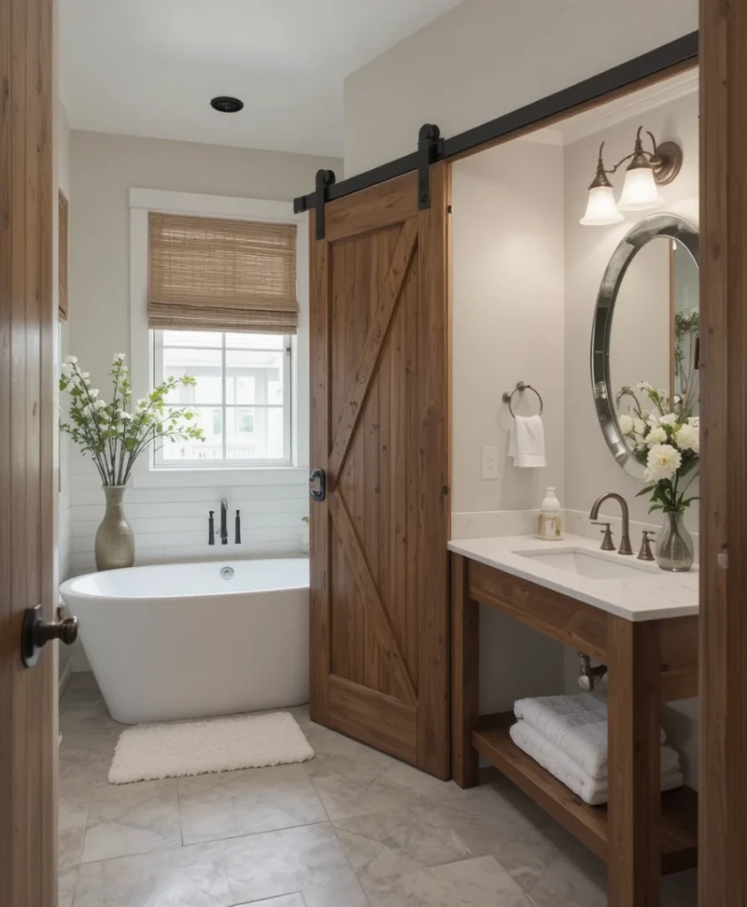 Replace a standard door with a sliding barn door. It saves space and instantly adds farmhouse flair with a modern twist.