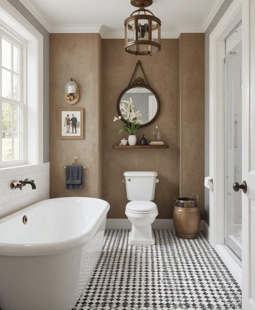 Add character with black-and-white patterned tiles or vintage-style flooring. It grounds the space and adds personality without overpowering it. Modern Farmhouse Bathroom