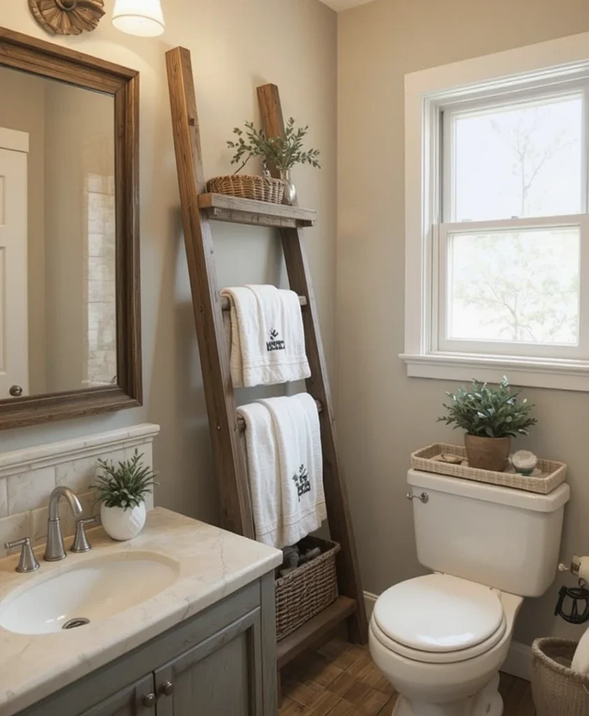 Use a wooden ladder as a towel holder. It’s a charming, space-saving decor piece that screams farmhouse comfort and creativity.