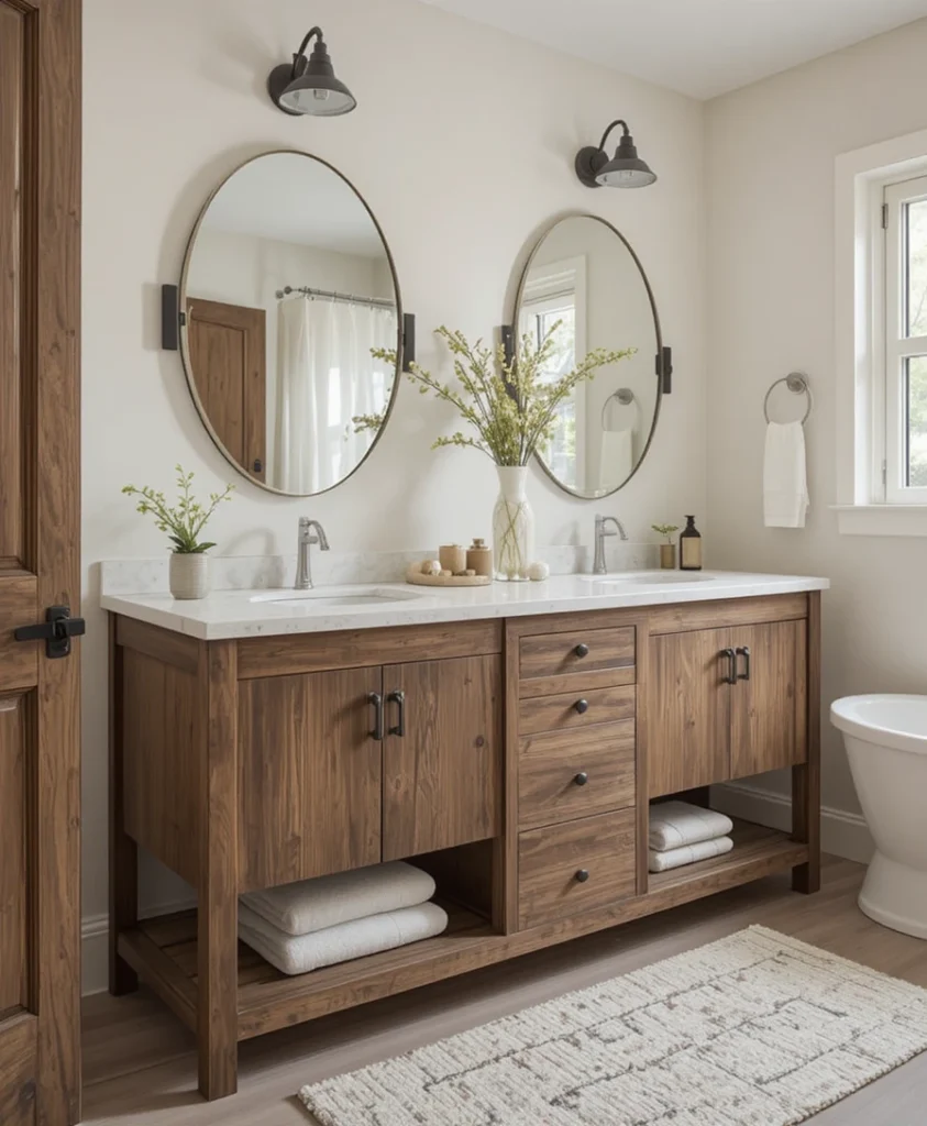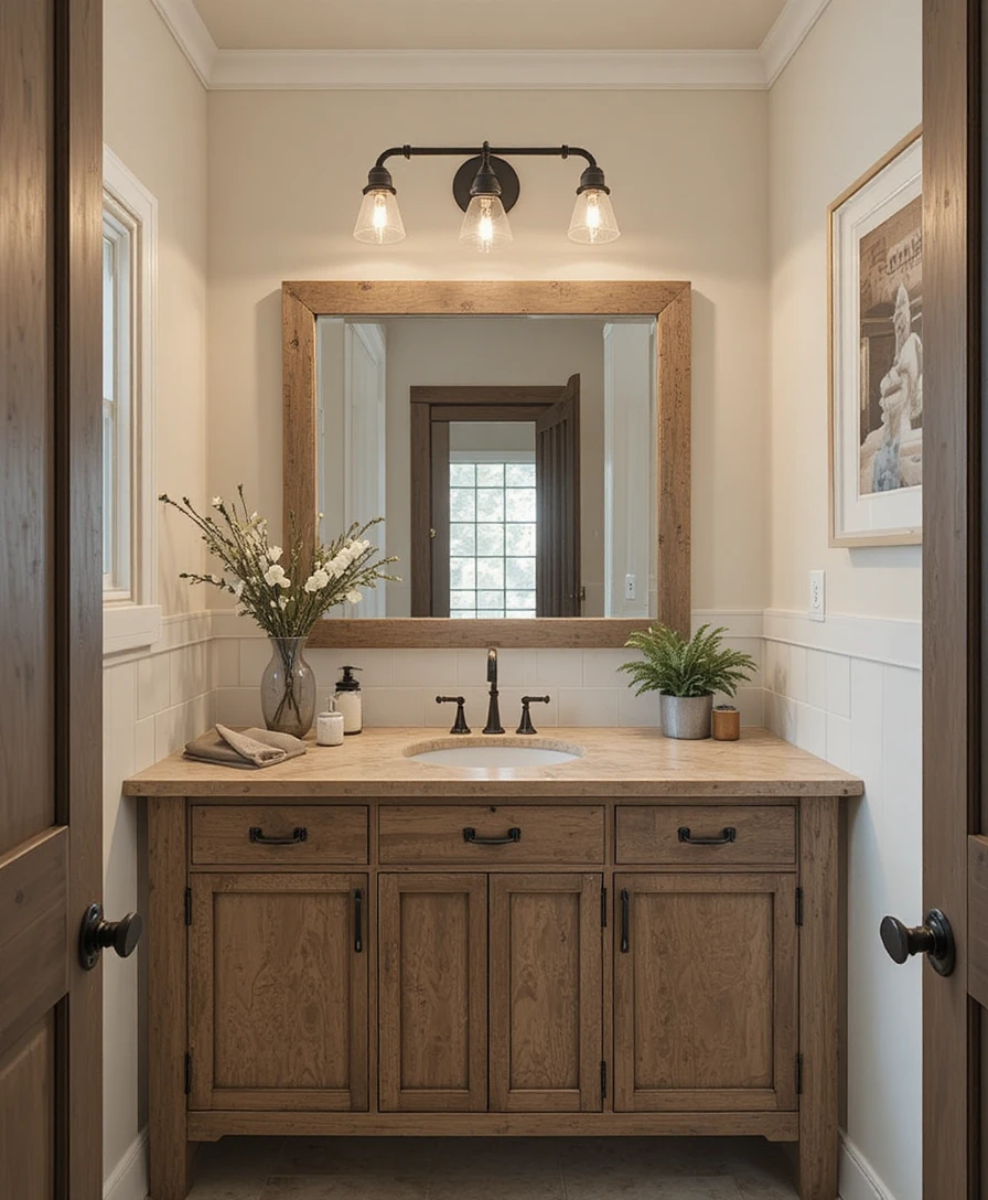 Hang industrial or barn-style lights above the mirror. Warm, dimmable bulbs create that cozy farmhouse glow everyone loves.
