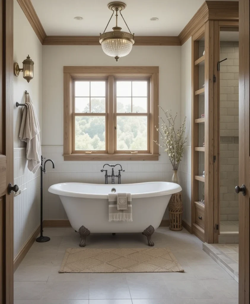 Add a clawfoot or freestanding tub surrounded by neutral tiles. This gives the bathroom a luxurious spa-like vibe while keeping it farmhouse chic.