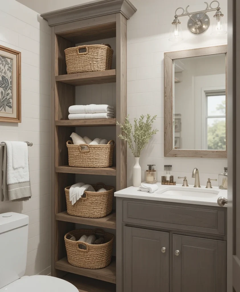 Replace closed cabinets with open wooden shelves. Store towels or toiletries in woven baskets for that perfect mix of function and rustic elegance. Modern Farmhouse Bathroom
