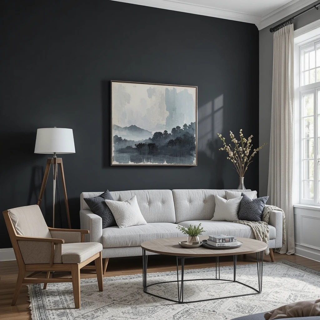 Dark charcoal gray adds sophistication and drama. Ideal for accent walls or modern living room features. Modern Paint Colors