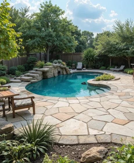 A stone patio around the pool creates a timeless outdoor living area. Natural stone complements the organic design while offering a durable surface. It’s perfect for hosting summer barbecues and poolside gatherings.