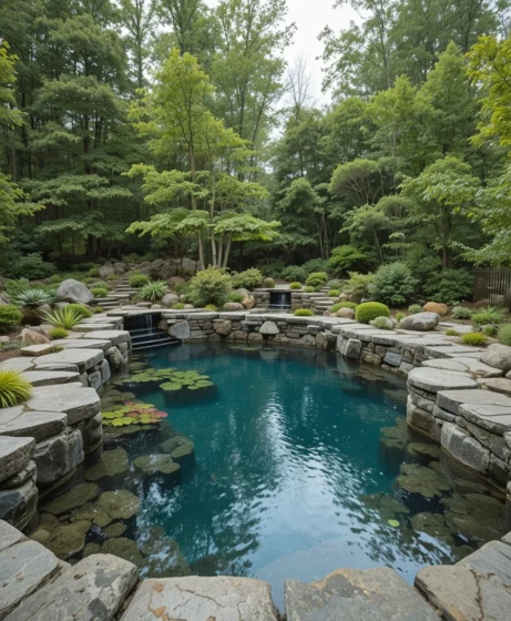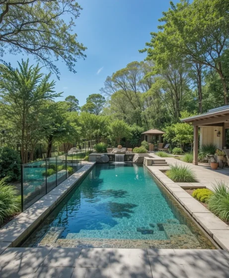 For compact spaces, a small natural plunge pool offers a refreshing dip without taking over the yard. Native plants around the edges help filter the water. It’s a smart solution for urban homes with limited space.