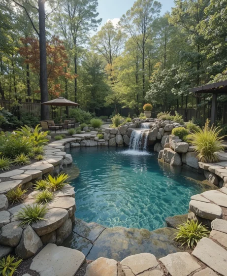 A cascading waterfall not only adds visual appeal but also helps circulate water naturally. The sound of flowing water creates a calming atmosphere. This idea brings movement and life to your backyard retreat.